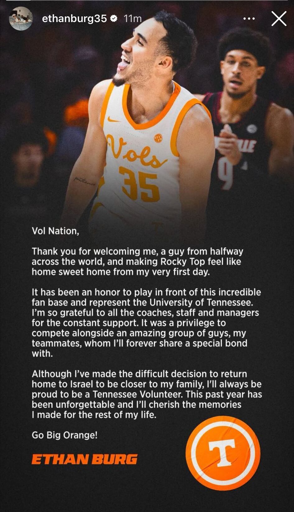 איתן בורג, שהגיע עם מכללת טנסי עד לשלב 8 הגדולות בטורניר המכללות העונה, הודיע בסטורי באנגלית בחשבון האינסטגרם על חזרה מיידית לישראל.